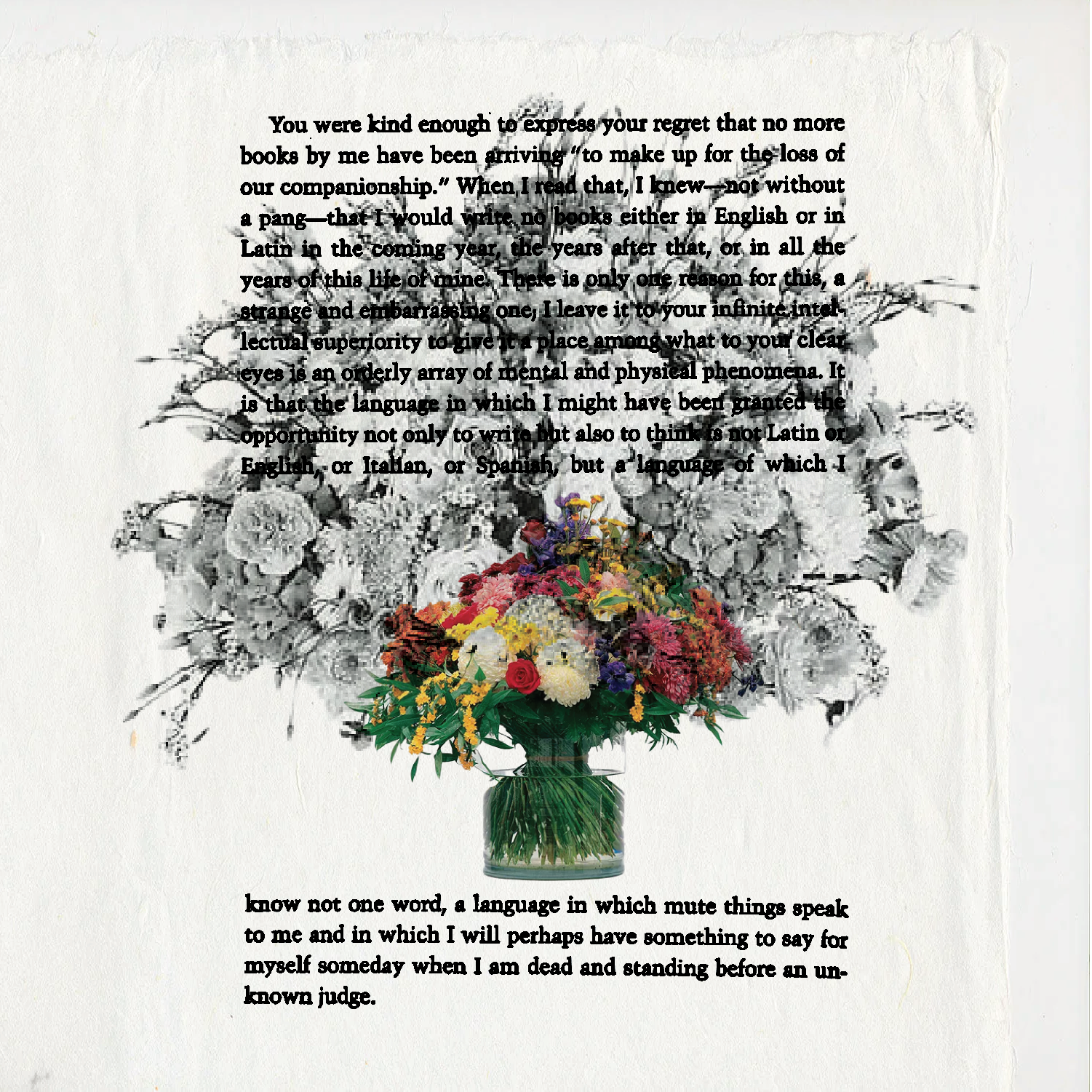 “This is the era destined to the intermittence of a language unburdened of words and dispossessed, the silent halt of that to which without obligation one must nonetheless answer. And such is the responsibility of writing — writing which distinguishes itself by deleting from itself all distinguishing marks, which is to say perhaps, ultimately, by effacing itself (right away and at length: this takes all of time), for it seems to leave indelible or indiscernible traces.